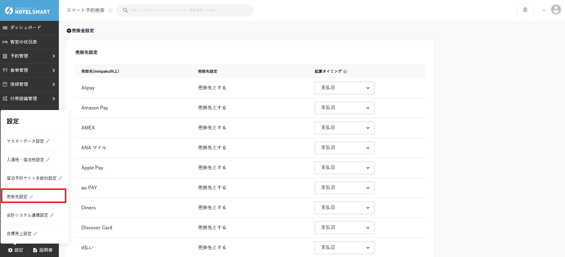 売掛先設定では予約経路(OTAや旅行会社)、決済サービス(クレジットカード・電子マネー)、法人・団体などの売掛先への売掛金の計上タイミングを設定できます。
