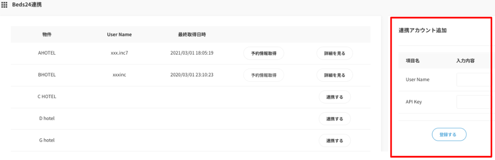 Beds24アカウント:アカウントの連携で追加したBeds24アカウント