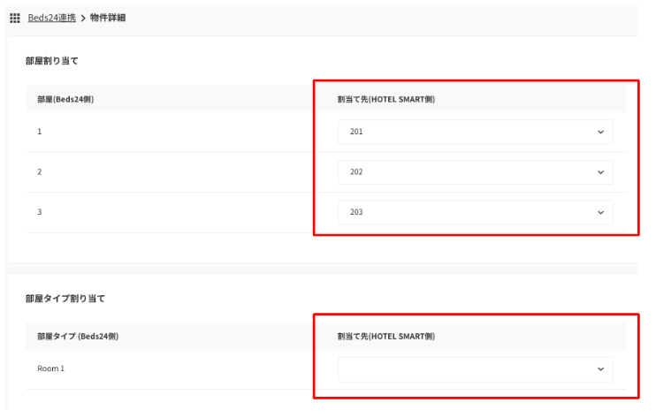 〖部屋割り当て〗にてBeds24上の部屋が左側に表示されるので、対応する部屋を割り当てて保存してください。