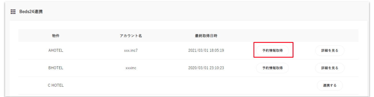 Beds24連携ページにある「予約情報取得」ボタンを押すと取り込むことができます。