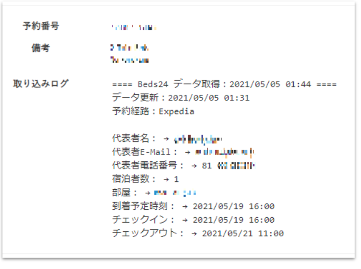 予約詳細ページの〖予約付帯情報〗にて、OTA予約番号、備考、更新タイミング、予約の基本情報をご確認いただけます。