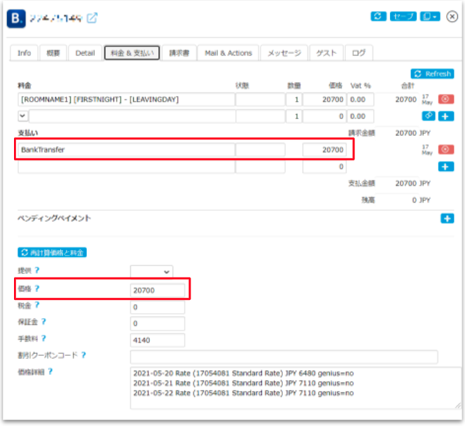 料金情報は、【価格】の部分、支払い方法とその金額は【支払い】欄の内容が反映されます。