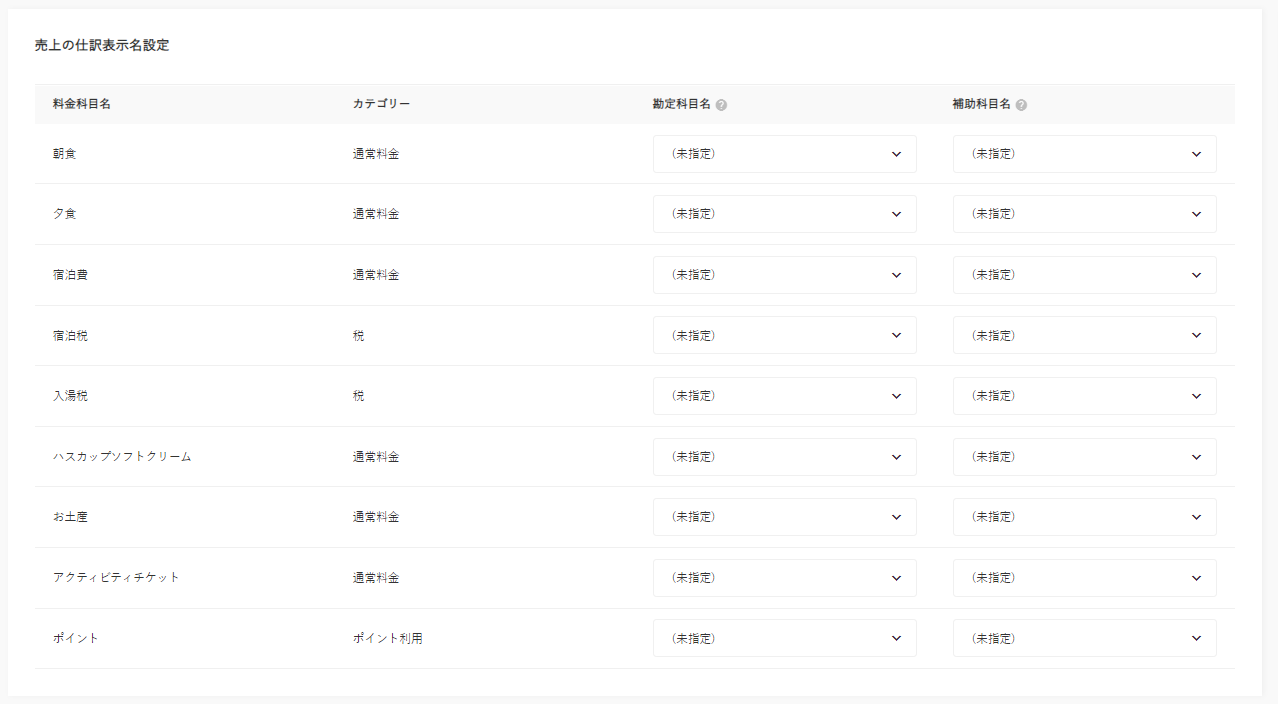 各料金科目(売上科目)に対して、仕訳の際の勘定科目名と補助科目名を設定します。