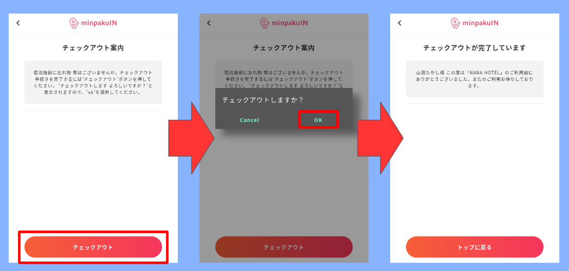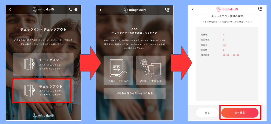 ※基本的にチェックイン時の操作と同様です。