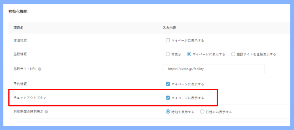 【有効化機能】にて、『チェックアウトボタン』の項目に✓を入れていただくと、
