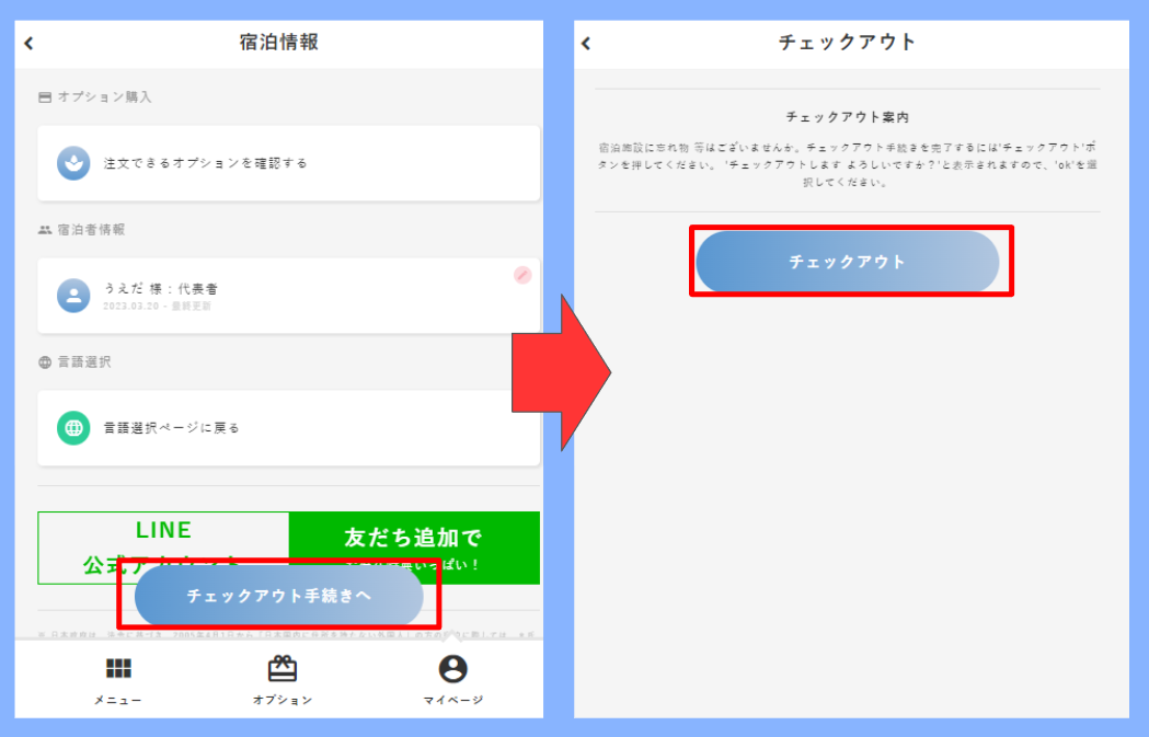 マイページにチェックアウトボタンが表示され、お客様自身でチェックアウトを行っていただけます。