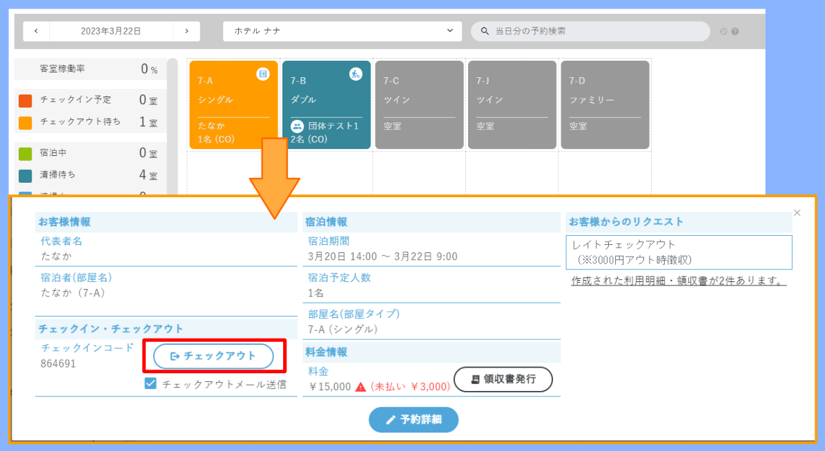 チェックイン時同様、、[当日分の予約検索]欄にて、お客様のお名前を入力して該当予約の部屋を探していただいても構いません