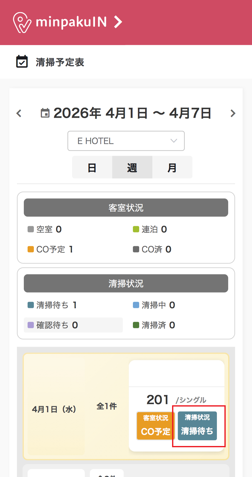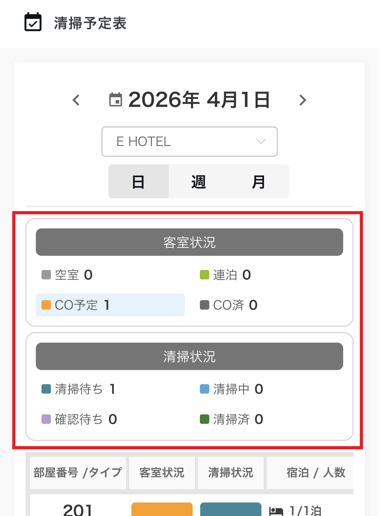 部屋・部屋タイプ・客室状況・清掃状況が表示されるので、対応が必要な予定を確認しましょう。