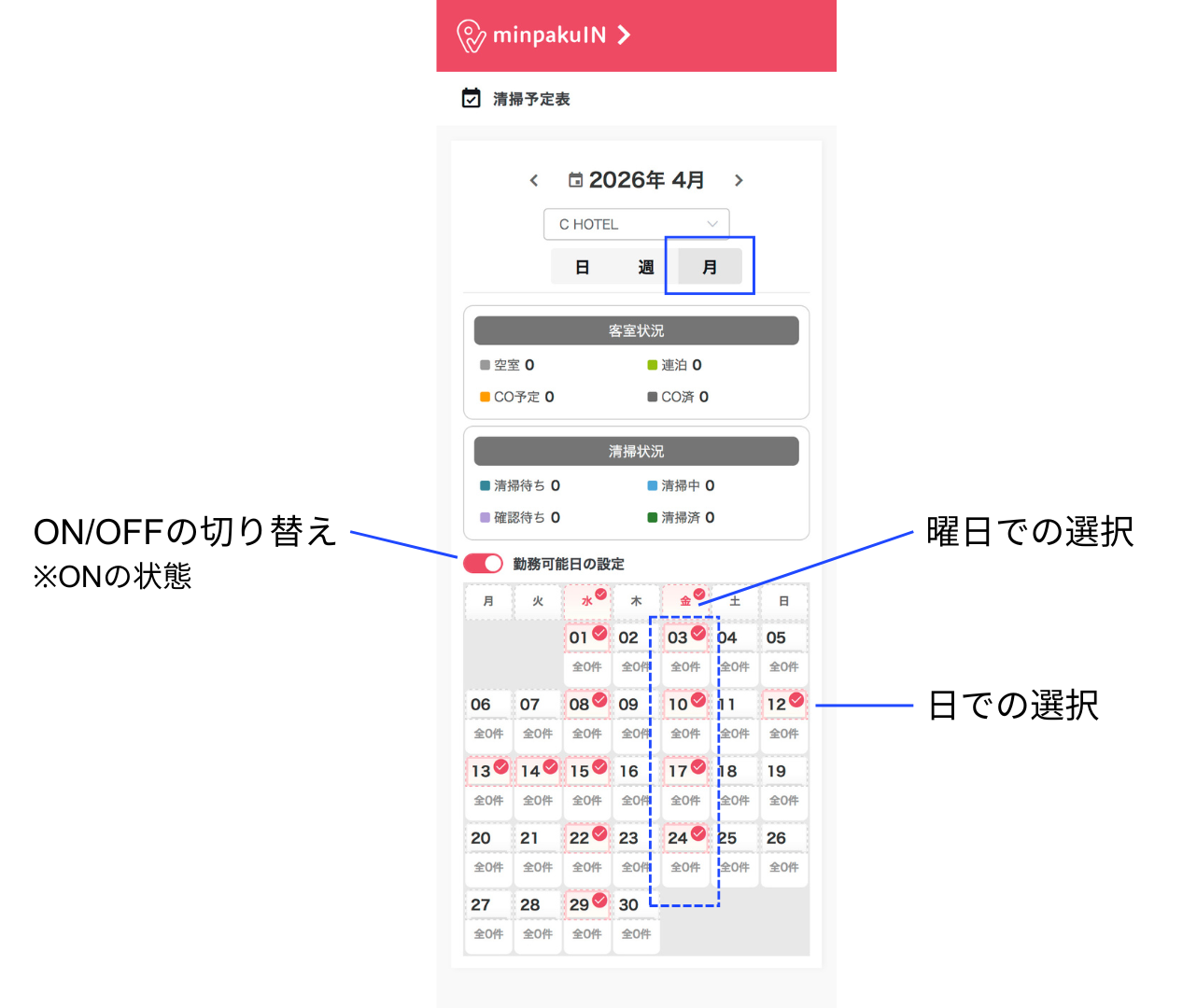 清掃予定がある場合、週表示と非表示の画面で内容を確認できます。