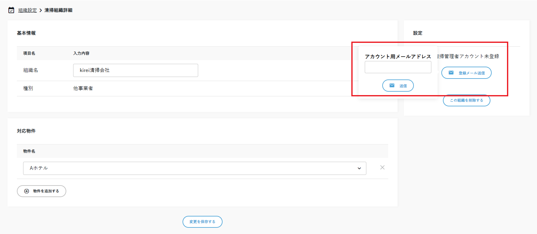②アカウント用メールアドレスの欄に清掃会社のメールアドレスを入力して「送信」をクリックします
