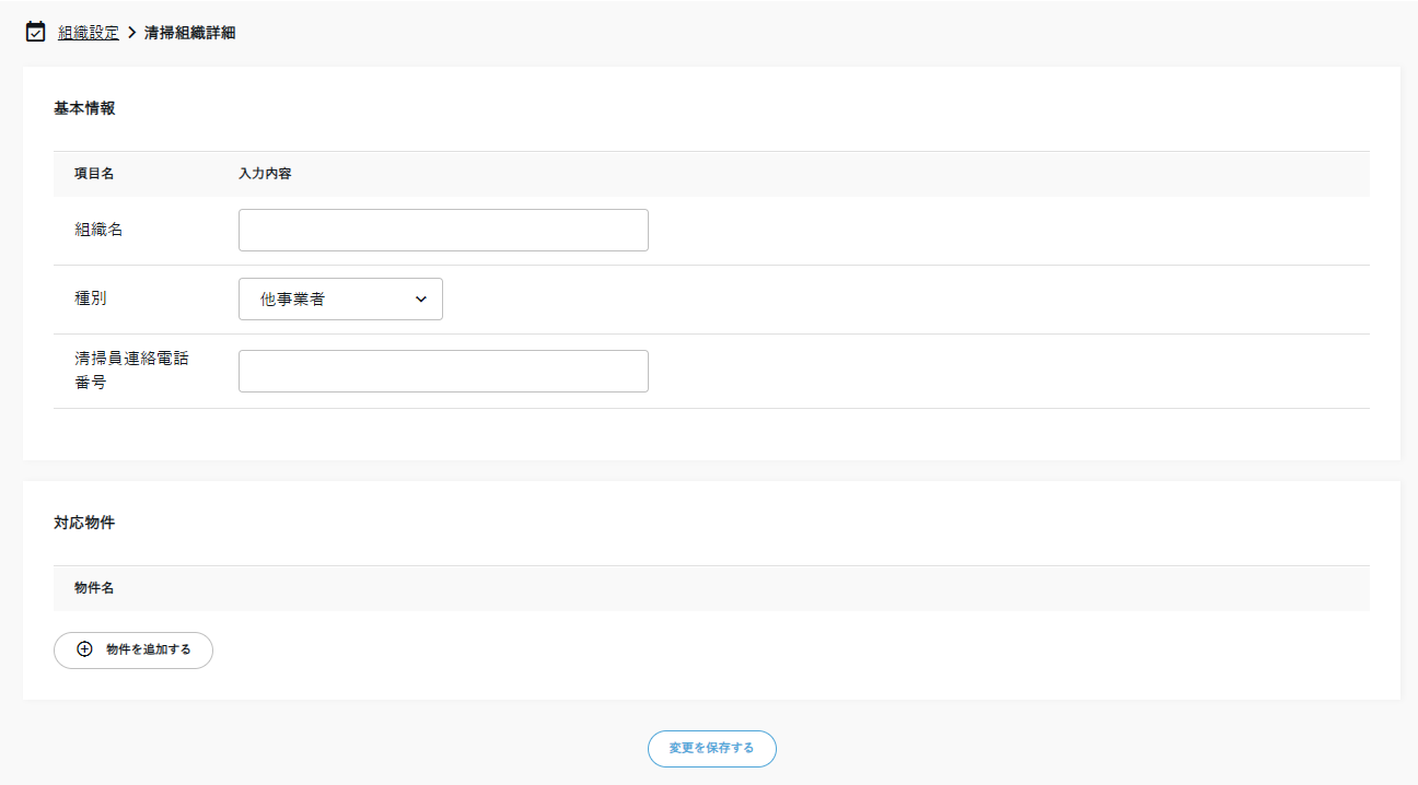 「⊕物件を追加する」をクリックし、この清掃組織が対応する物件を登録します。