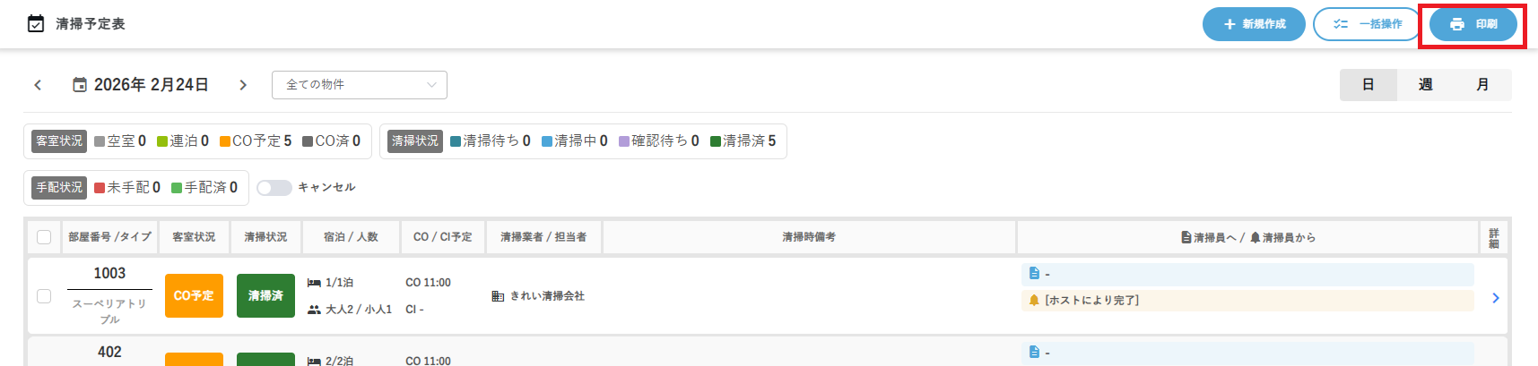 未手配 / ドラフト中 / 手配済み / 清掃中 / 清掃完了 / 確認完了