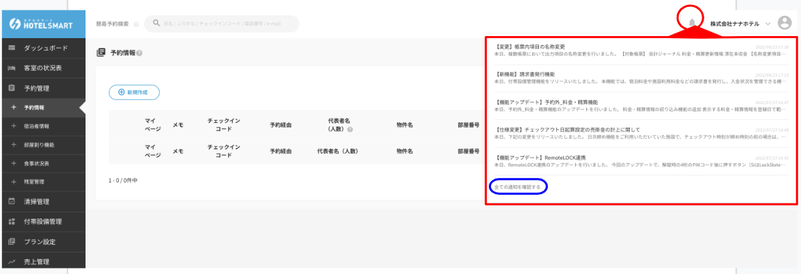クリックすると最新のお知らせを確認でき、左下の「全ての通知を表示する」よりお知らせ一覧ページを開くことが出来ます。