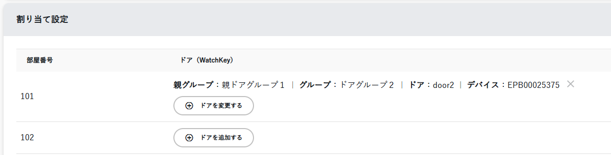 〖割り当て設定〗欄で、該当のドアの箇所で✕ボタンを押し、変更を保存で解除されます。