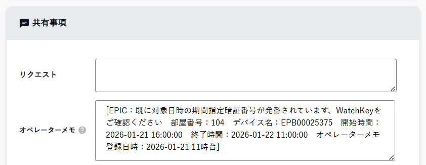 万が一重複している場合、オペレータメモに下記のようなアラートが記録されます。重複が無いように予約の修正を行ってください。