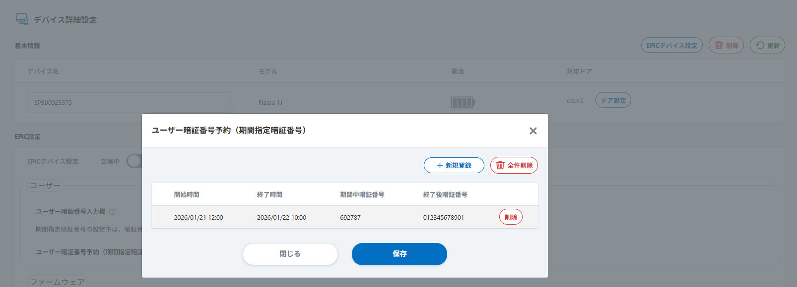 デバイス>詳細設定 の ユーザー暗証番号予約(期間指定暗証番号)「設定状況確認」をクリックすると確認できます。