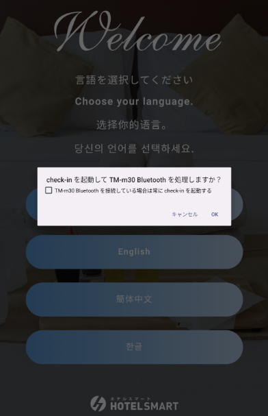 - (タブレットに「check-inを起動して~を処理しますか?」と表示されたら、チェックを入れてOKボタンを押します)