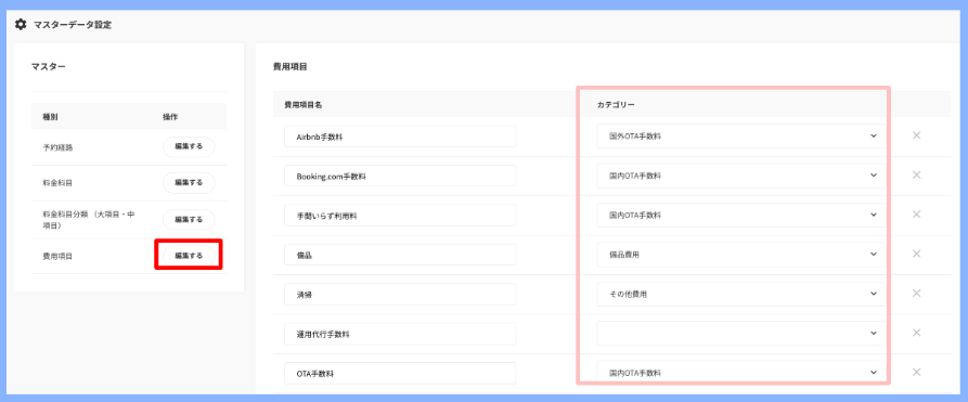 ⚙設定>マスターデータ設定>費用項目「編集する」 より、国外OTA手数料用の費用項目を追加し(費用項目名は自由に設定可能)、カテゴリーを「国外OTA手数料」に設定してください。