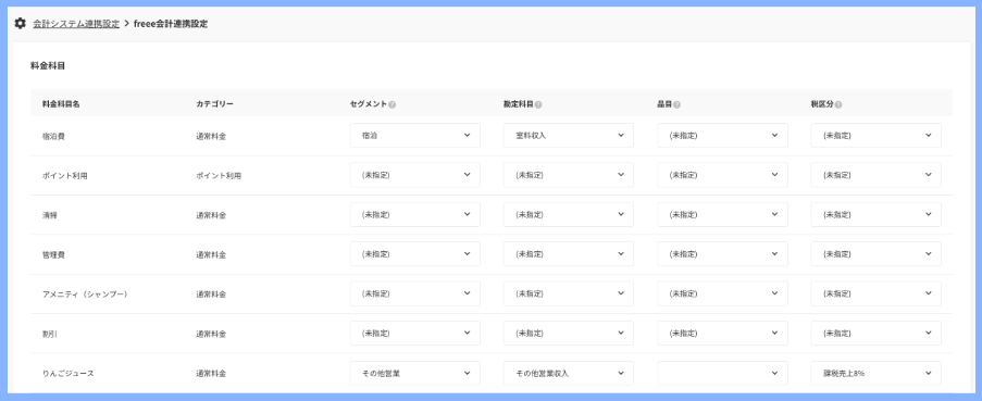 ②⚙設定>会計システム連携設定 >freee会計連携「編集する」の 【入金一覧】に①で入力した内容が反映されるので、カテゴリーを選択して保存してください。