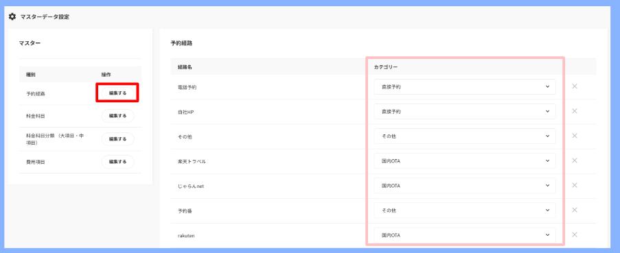 ⚙設定>マスターデータ設定>予約経路「編集する」 より、各予約経路のカテゴリーを設定してください。