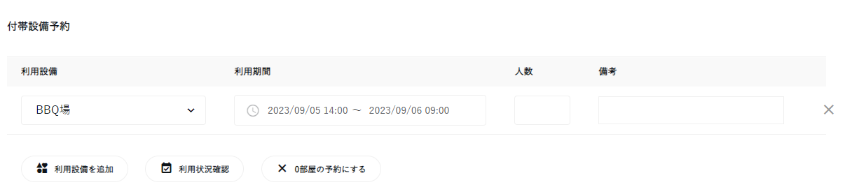 ※宿泊予約がない場合も、設備利用の予約を作成可能ですが、一部集計(平均宿泊者数・平均宿泊日数・総予約数・キャンセル数 etc.)に影響が出ることをご了承ください。