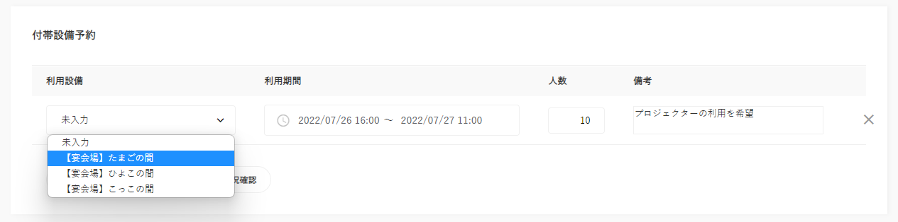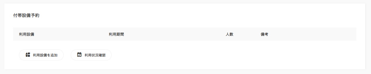 付帯設備の利用のみで予約を作成する場合、【付帯設備予約】欄に表示されている