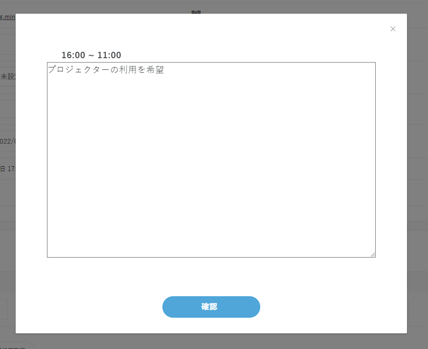 設備の利用時間・設備名・予約の代表者名・予約に紐づく料金情報が表示されます。