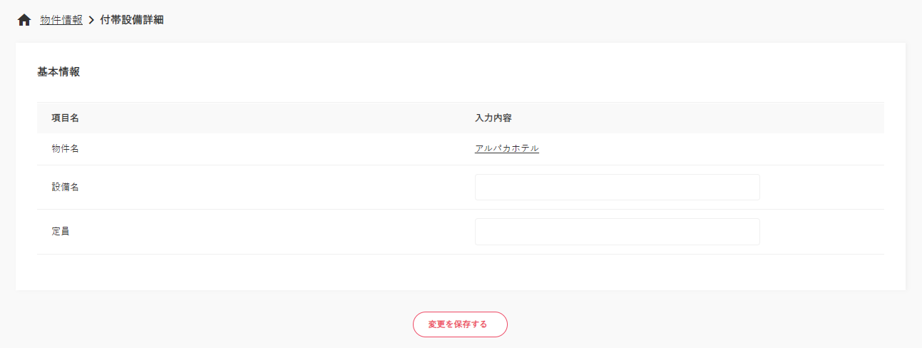 ③付帯設備詳細ページの【基本情報】欄にて、設備名・定員を入力します。