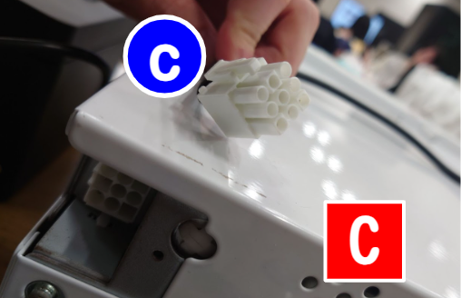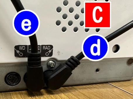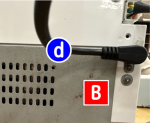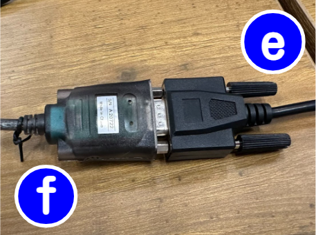 シリアル通信ケーブル(e)を硬貨釣銭機(C)の真ん中のポートへコードが上に来るように差し込み、もう一方をUSB-シリアル変換ケーブル(f)に差し込みます