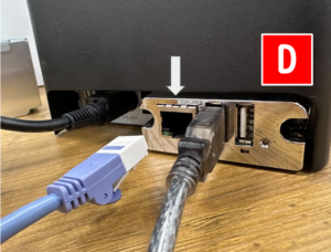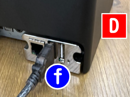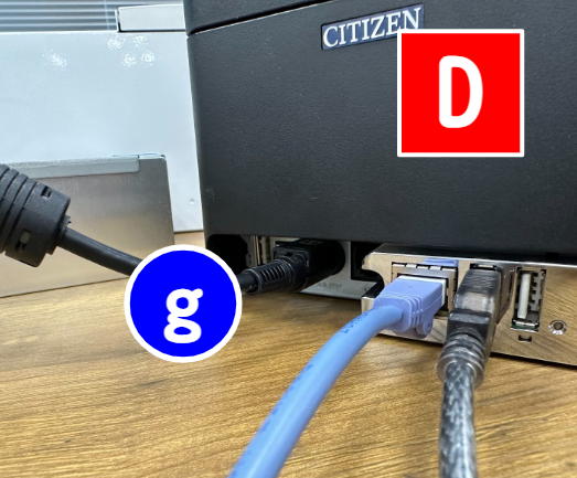 さらに、USB-シリアル変換ケーブル(f)のUSBをプリンタ(D)に差し込みます