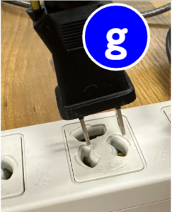 電源ケーブル(g)をプリンタ(D)とコンセントに差し込みます