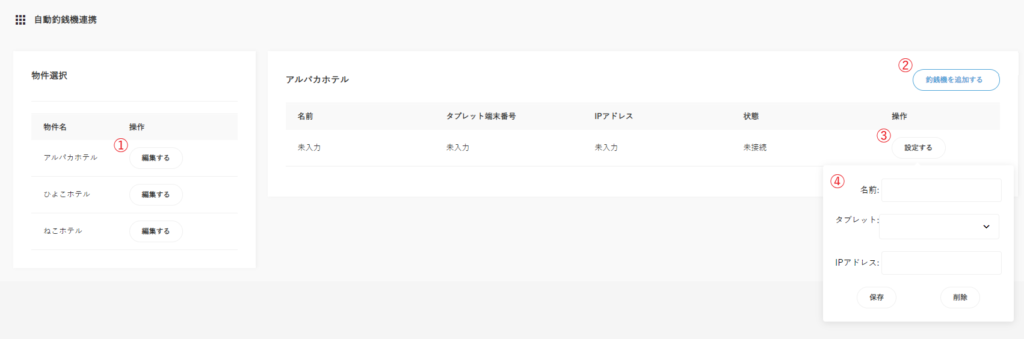 タブレット:物件に紐づけられているチェックインタブレットの端末番号を選択してください。