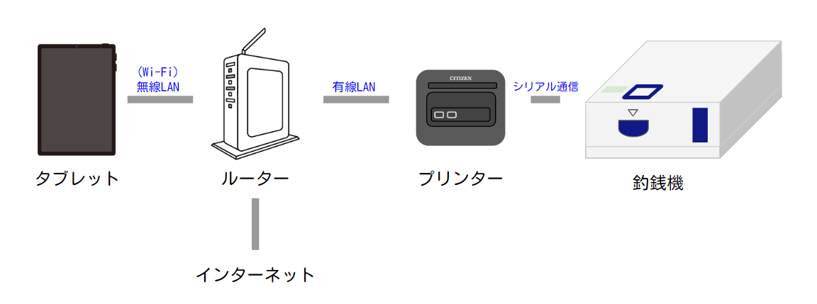・AndroidタブレットはWIFI接続、レシートプリンタは有線LAN接続です。