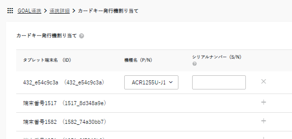 設定するタブレットの欄で+をクリックし、カードキー発行機の裏側に記載のシリアルナンバーを入力します。