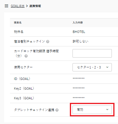 タブレットチェックイン連携を「有効」に設定すると、カードキー発行が可能になります。