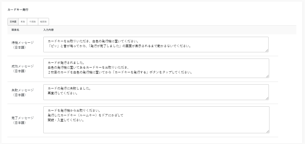物件詳細(物件管理>物件情報)にて[宿泊者別チェックイン]が「許可」されている場合はカードキーの発行ができません。