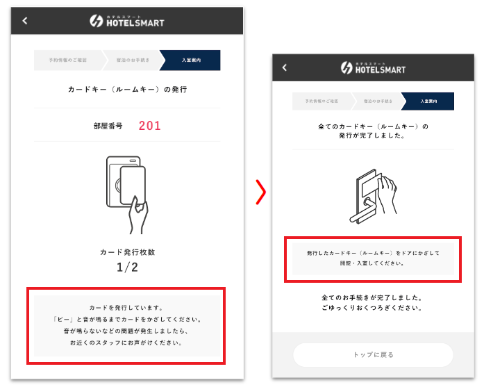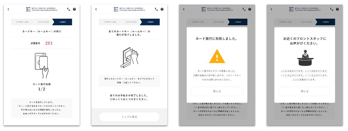 これらに当てはまる予約では、チェックイン完了画面でフロントでカードキーを渡す旨の文言が表示されます。