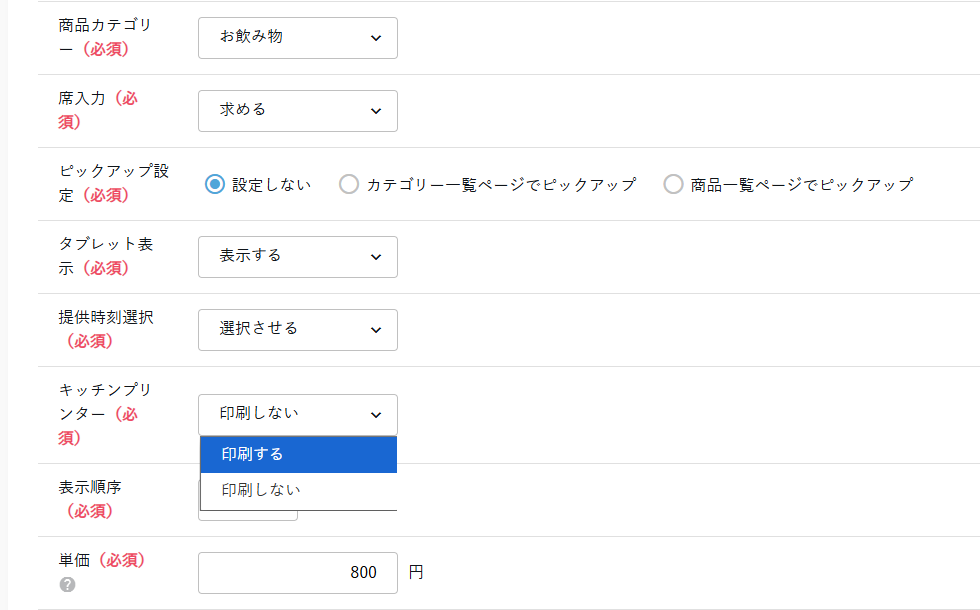 印刷する商品では、項目[キッチンプリンター]を「印刷する」にします。