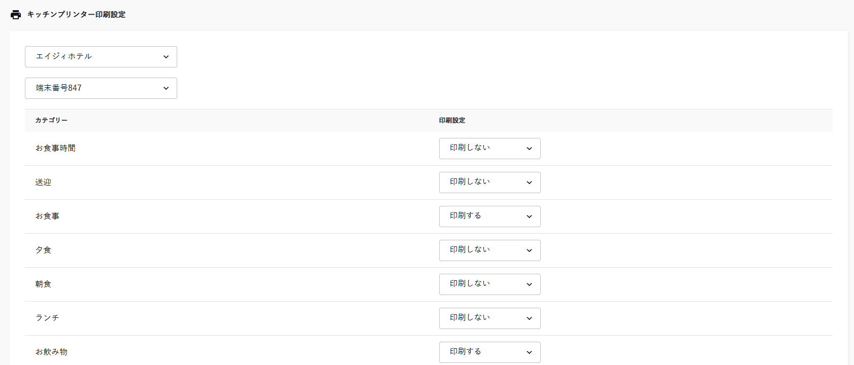 モバイルオーダー>キッチンプリンター設定 にて、物件とタブレットを選択のうえ、印刷したい商品カテゴリーを「印刷する」に変更して保存します。