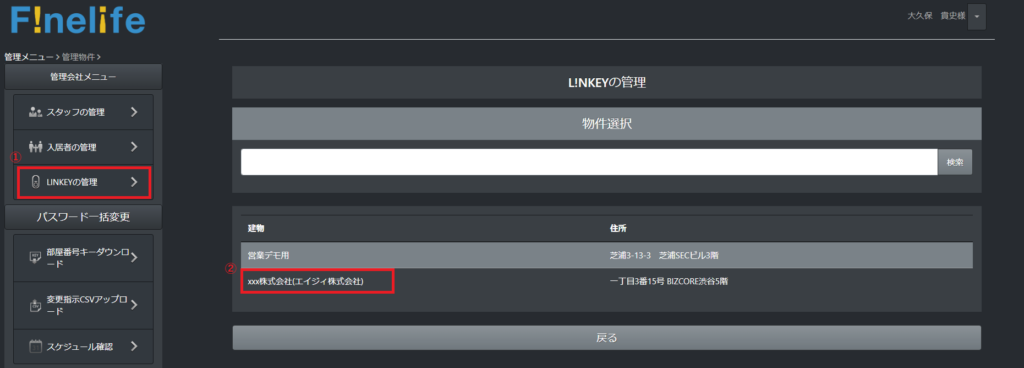 ①L!NKEYの管理>②建物を選択