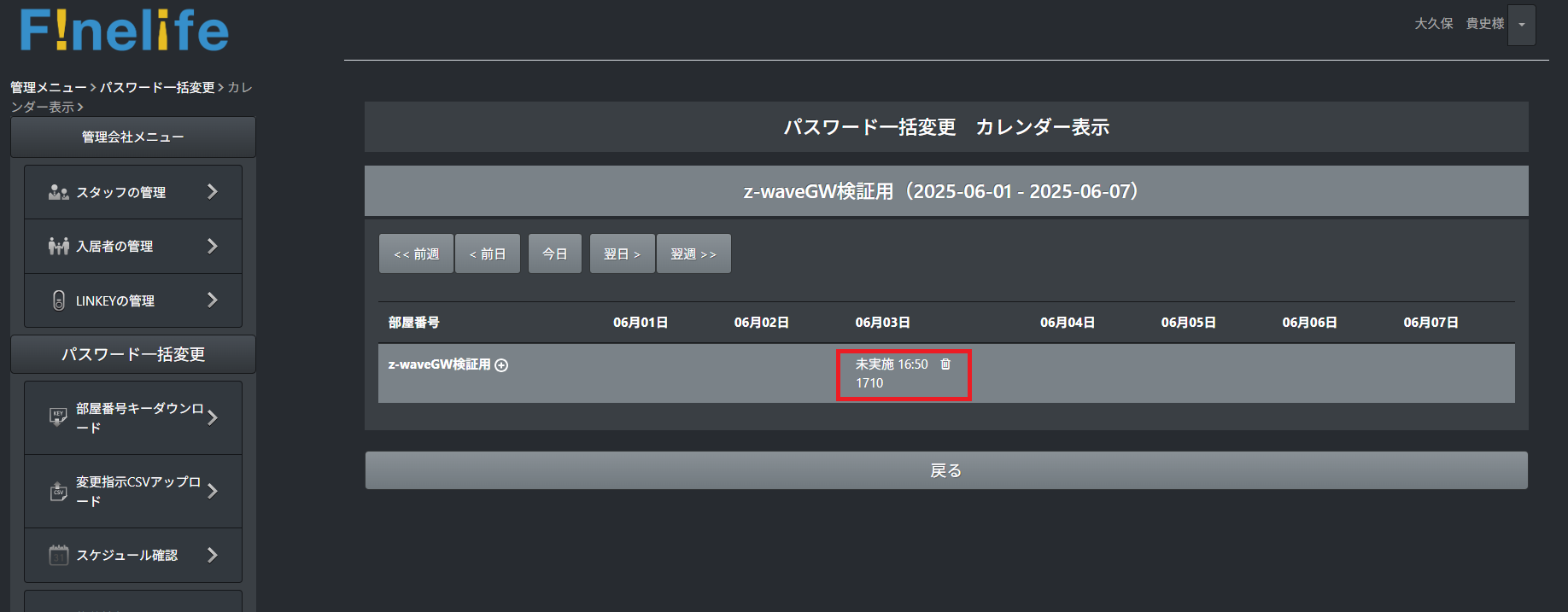 まずは、発番された鍵番号がF!nelifeの管理画面にて表示されているか確認をしてください。