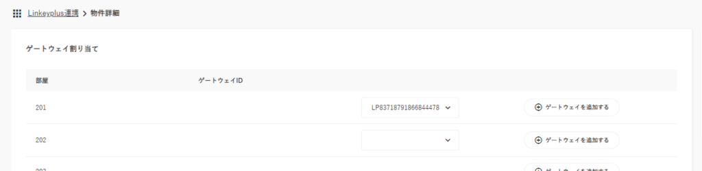 「⊕ゲートウェイを追加する」ボタンを押して、部屋に対応する鍵のゲートウェイIDを選択します。