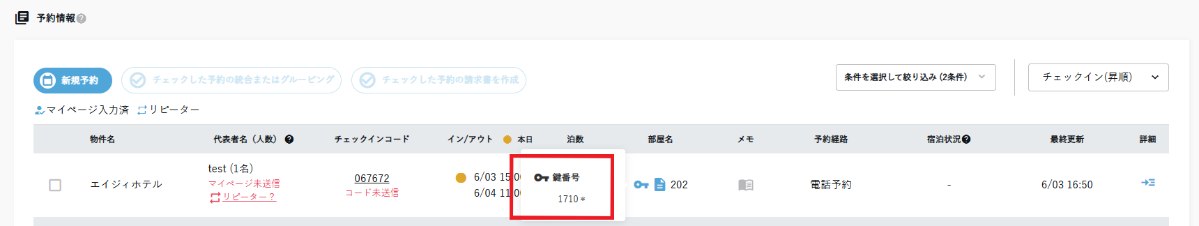 鍵番号が発行されている予約については、部屋名の左側に鍵マークが表示されているので、鍵マークをクリックすることで鍵番号が確認できます。