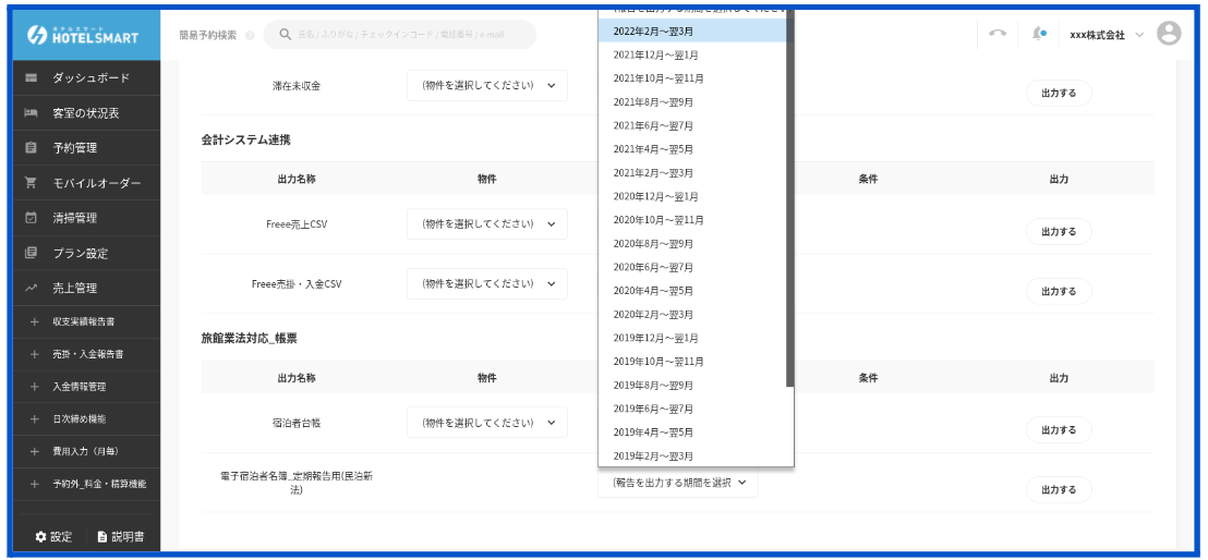 分析帳票>帳票・CSV出力>下にある旅館業法対応_帳表の「電子宿泊者名簿_定期報告用(民泊新法)」より報告を出力する期間を選択し、右側の“出力する”をクリック