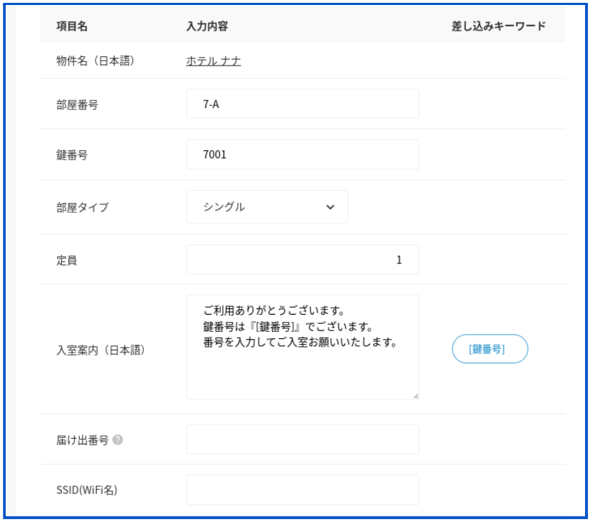 物件管理>物件情報>部屋数をクリック>詳細をみる より、部屋詳細にアクセスし、届け出番号の欄に番号を入力して保存します。