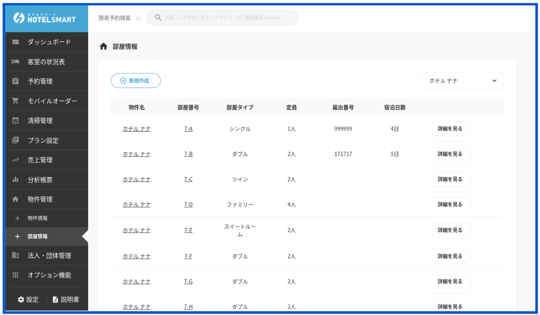 部屋情報の一覧にて、届出番号を登録した部屋の宿泊日数を確認することが出来ます。