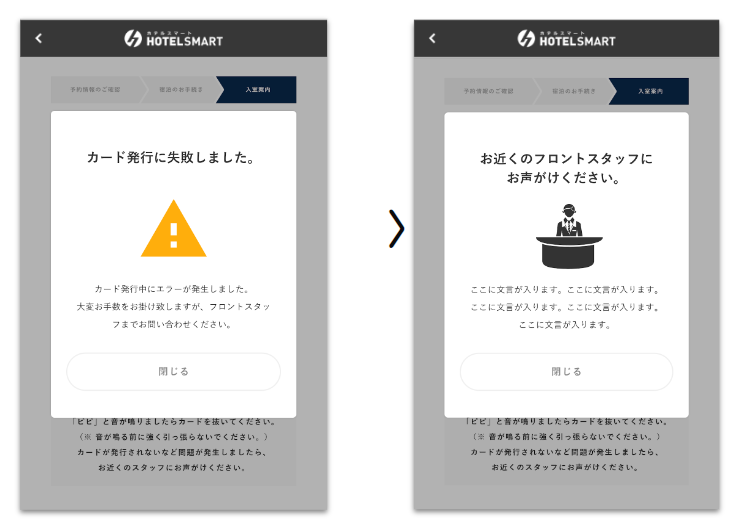 これらに当てはまる予約では、チェックイン完了画面でフロントでカードキーを渡す旨の文言が表示されます。