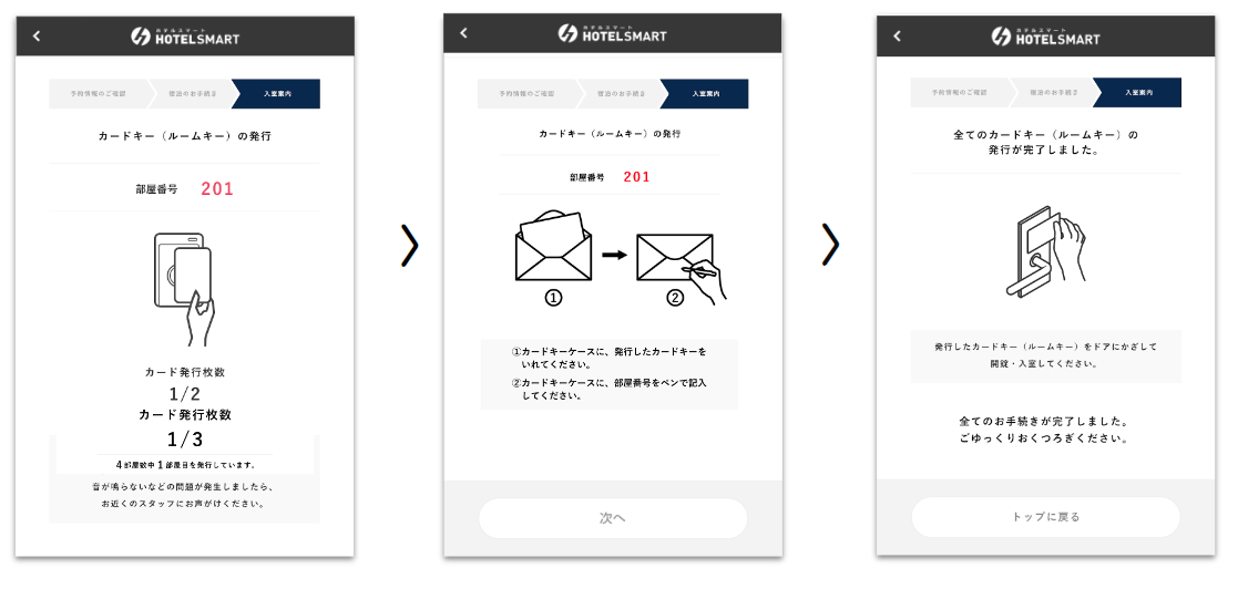 カードキーの発行は、タブレットでのチェックイン作業を一通り終えた最後のページで案内されます。