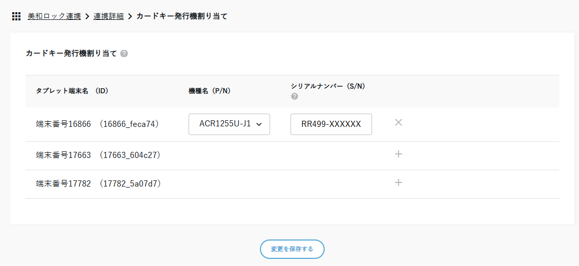 設定するタブレットの欄で+をクリックし、カードキー発行機の裏側に記載のシリアルナンバーを入力しましょう。