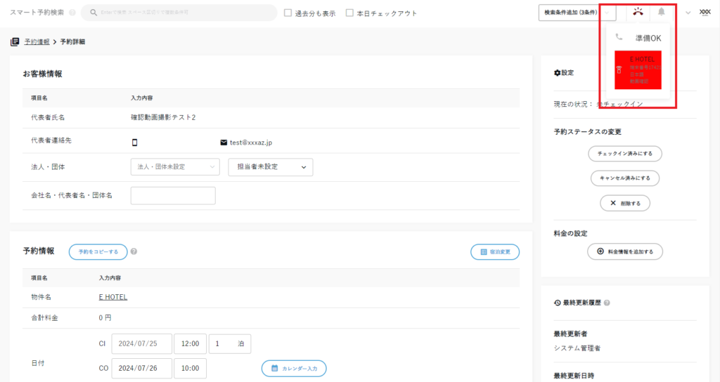 動画が撮影されたタイミングで管理画面に通知が来て、承認をすると行うとチェックイン完了できます。